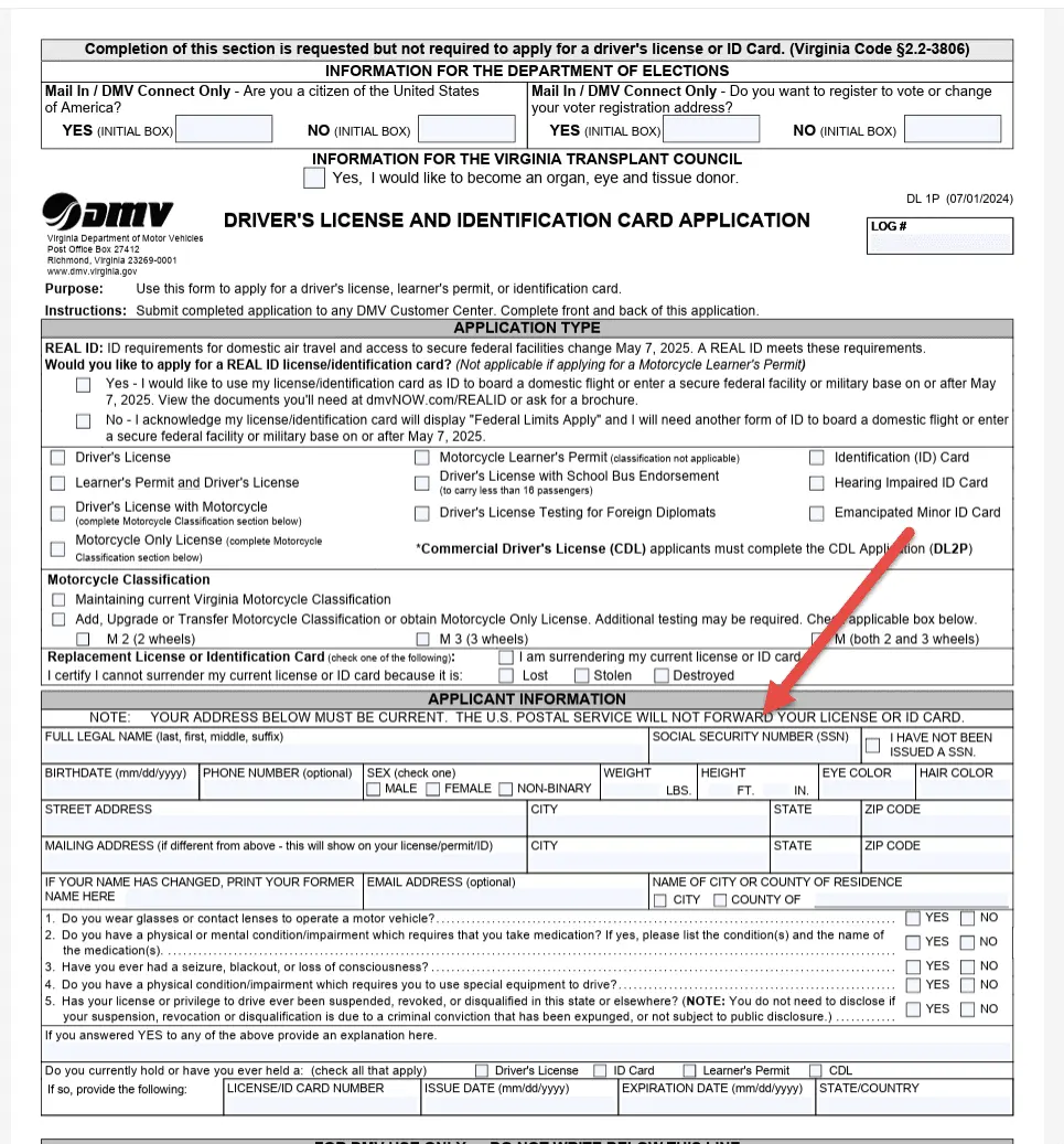 Below is the VA Drivers License Application with a big red arrow pointing to the filed (notice it is not asking for last 4 or SSN).