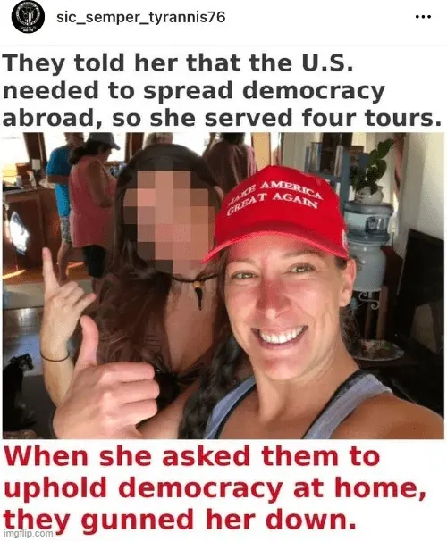 Ashli Target didn't break into the Capitol to ask for democracy. She broke in because she's a domestic terrorist who sought to kill democracy. Democracy isn't storming the Capitol because you're pissed you lost an election. She got what she deserves. She should be given a Darwin award.