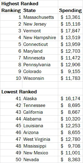 I certainly agree with that statement. Poor performing schools which are usually schools filled with kids from low income families in high crime areas are loaded with special ed. kids with Emotional and Behavior Disorders, Intellectual Disabilities, Learning Disabilities, requiring special attention remedial education, early intervention programs, vocational cooperative work programs, increased security for staff and students, and in many cases lower class sizes. For these and other reasons per pupil cost in such schools can easily be 50% higher the best schools in a district. Cities and states with large numbers of such schools will have high costs.