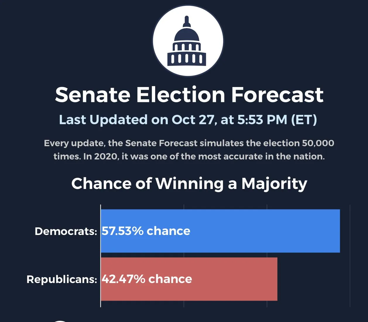 Flies in the face of all the polling but anything can happen. It’s looked for a long time like a Democrat win in the Senate and a slight loss in the house but maybe your gut feeling is better.R's will win roughly 52-54 senate seats.