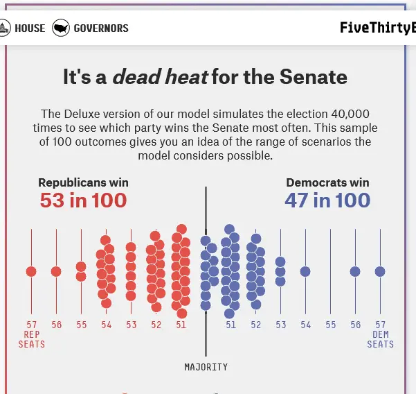 In the Senate, RCP currently shows a 48-45 R lead with 7 toss up seats available for grabs. R's winning 3 of those 7 seats would be slightly less than half (and NOT a "red wave") and R's winning 4 of those 7 seats would be slightly more than half (arguably a "red wave"). R's winning 5 of those 7 seats would undoubtedly be a "red wave"... and guess what, R's are very well poised atm to win 5 of those 7 seats (WI, PA, NV, GA, AZ) and they might even win NH and WA as well... Smells like a "red wave" to me.