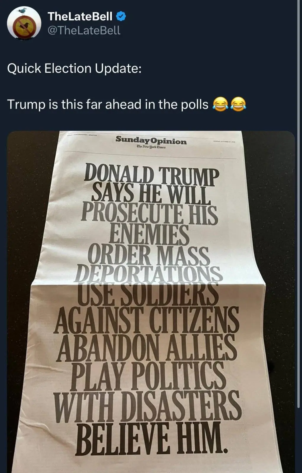I'm not going to try to convince anyone. I know Harris and the Establishment will win. I've accepted this. I suspect that before the end of her term WWIII will have begun, just as I predicted war and the loss of American influence when Biden won.