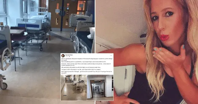 A Covid denier who went into hospitals to film seemingly ’empty’ corridors and posted the footage on social media has been fined by police. The 30-year-old woman was fined £200 after she uploaded images and videos from inside several hospitals which ’caused angst in the community’, said Portsmouth Police. Hannah Dean, who describes herself as a ‘registered journalist’ from Portsmouth, posted images from hospitals across south-east England to Facebook in a bid to prove the virus is a ‘hoax’. The photos of corridors were claimed to be taken at the Queen Alexandra Hospital in Portsmouth, Southampton General hospital, the Princess Royal University hospital near Bromley, Kent, and St Richard’s Hospital in Chichester, West Sussex. Alongside a post of pictures allegedly taken at Queen Alexandra Hospital she wrote: ‘Hospital is the quietest I have ever seen it! I walked all over the hospital, including A&E! ‘I know this is hard to get our heads around, but the government are lying to us! And the reason why they’re lying to us….. is very disturbing!’