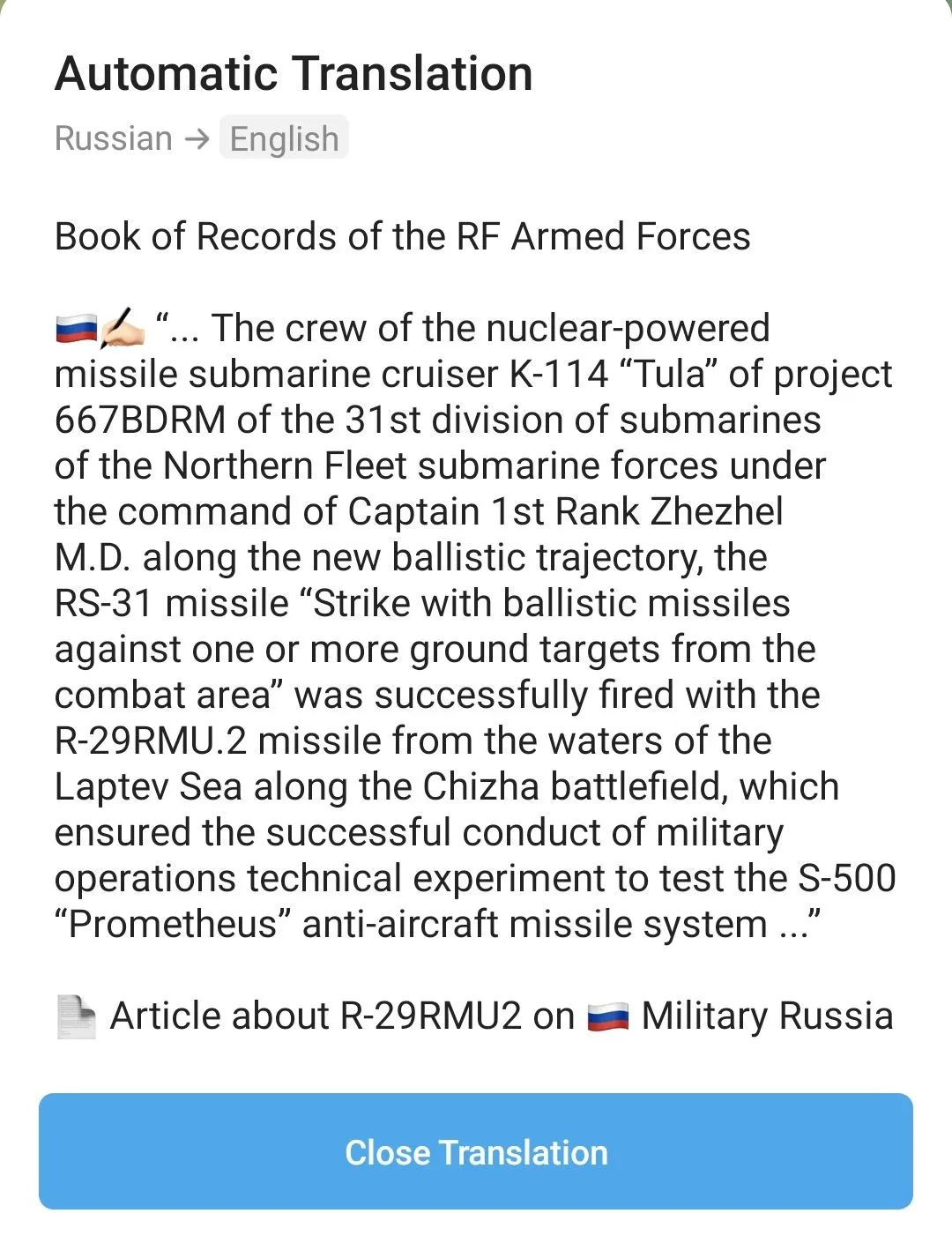 Failed Sineva test launches took place during the strategic command exercise “Security-2004” (held 10–18 February 2004), which also included the launch of a Molniya communication satellite and an R-36 missile. The launch failures involving nuclear submarines Novomoskovsk and Karelia may have been caused by a military satellite blocking the launch signal;View attachment 911702