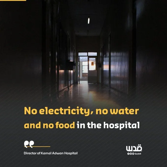 BREAKING | Director of Kamal Adwan Hospital: The hospital is besieged, and we have no electricity, water, or food. We have 65 injuries, including 12 children in intensive care, 6 children with serious injuries, 3,000 displaced people, and 100 medical staff members.