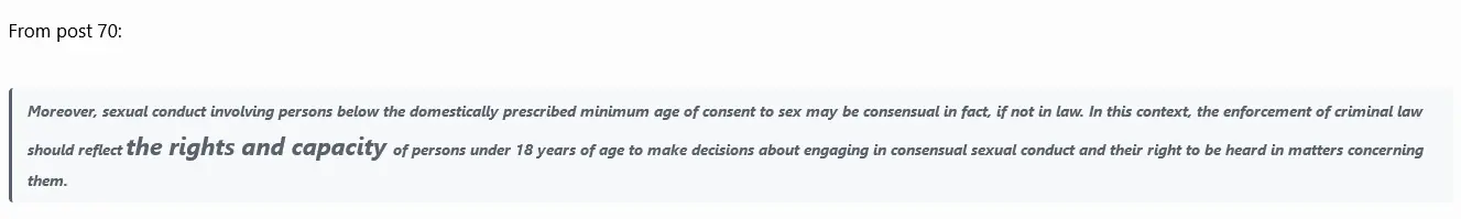 What this means, is that the UN supports not enforcing the law, if a child is brainwashed or conditioned into believing that they can have a "consensual relationship," with an adult, or are even able to make that decision. . . .