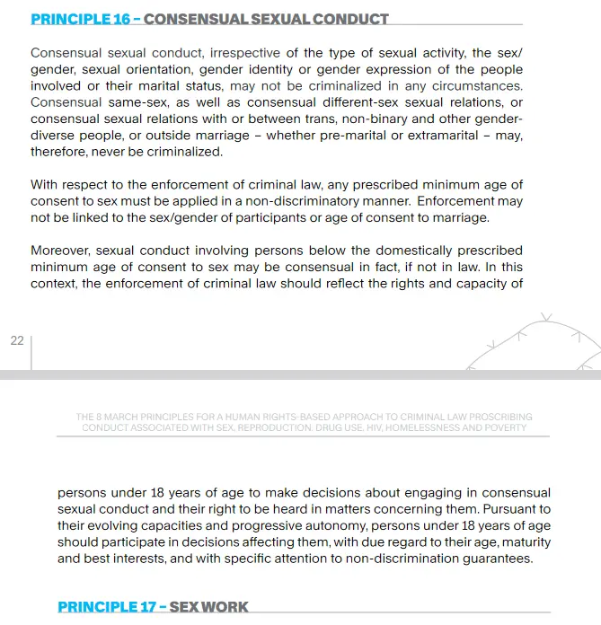 With respect to the enforcement of criminal law, any prescribed minimum age of consent to sex must be applied in a non-discriminatory manner. Enforcement may not be linked to the sex/gender of participants or age of consent to marriage. Moreover, sexual conduct involving persons below the domestically prescribed minimum age of consent to sex may be consensual, in fact, if not in law. In this context, the enforcement of criminal law should reflect the rights and capacity of persons under 18 years of age to make decisions about engaging in consensual sexual conduct and their right to be heard in matters concerning them.
