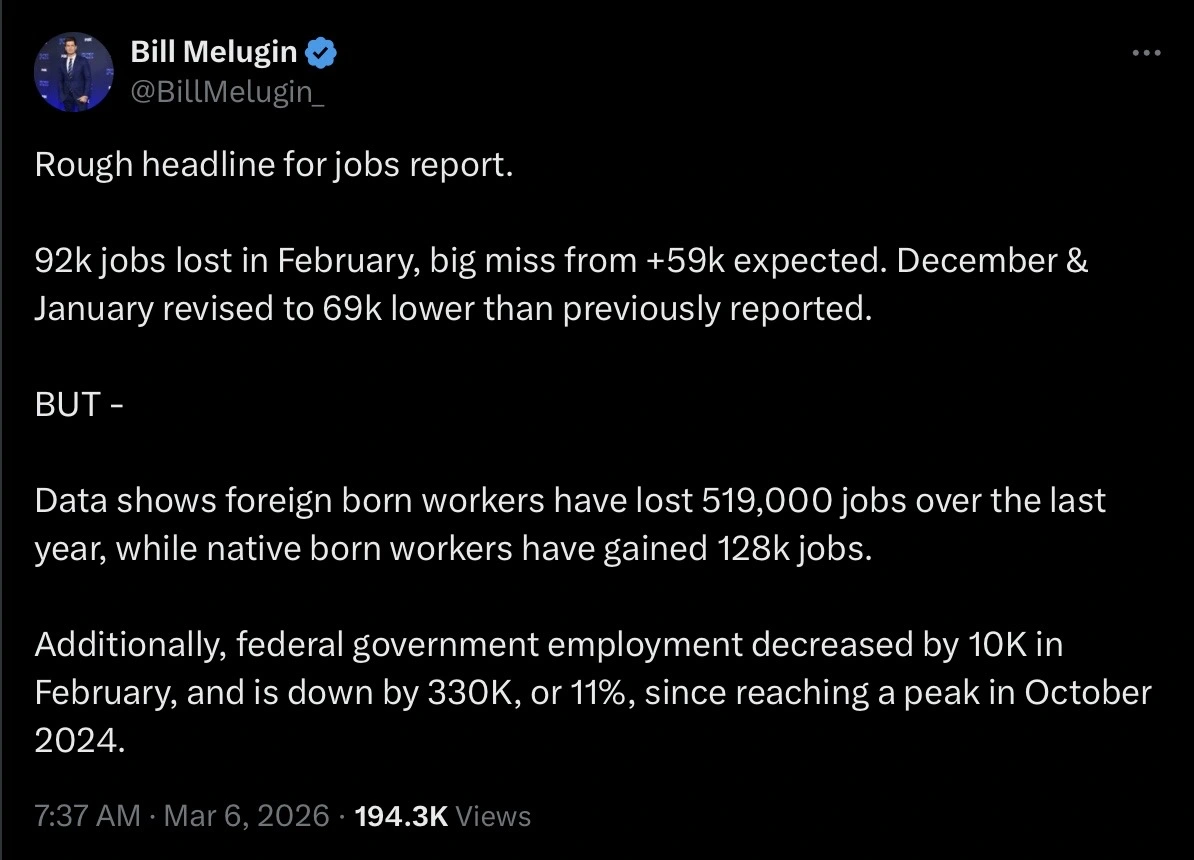 Those numbers are the opposite to what Trump promised. One more example of Trump’s incompetence!The job market since Trump took office - January 2025 thru February 2026