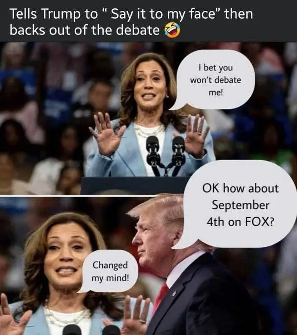 Kamala is too scared to do a debate she can't stage in advance, so after calling Trump a coward, now she's the one showing cowardice.