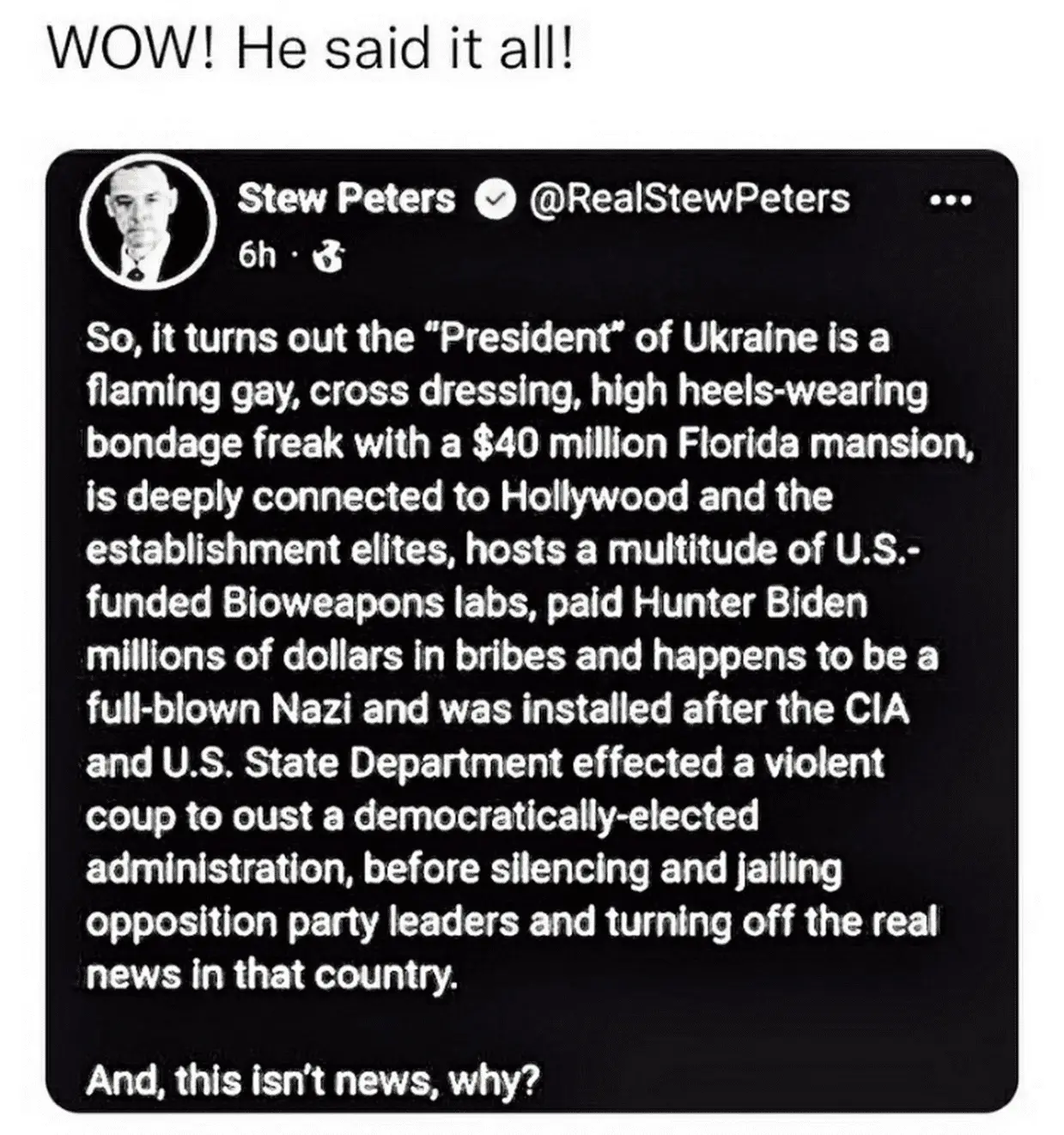 BlindBoo Diamond Member Joined Sep 28, 2010 Messages 58,859 Reaction score 17,735 Points 2,250 Oct 12, 2022 #122 Calypso Jones said: View attachment 709271 Click to expand... It is news I'm sure of it. In Russia. Do svidaniya.