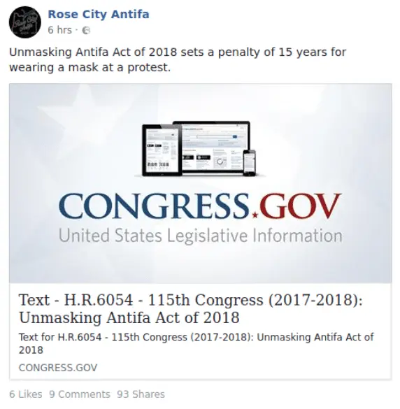 Introduced to the House Judiciary Committee by Rep. Dan Donovan (R-NY) and co-sponsored by Peter King (R-NY), Ted Budd (R-NC) and Paul Gosar (R-AZ). H.R. 6054, the "Unmasking Antifa Act of 2018" states: