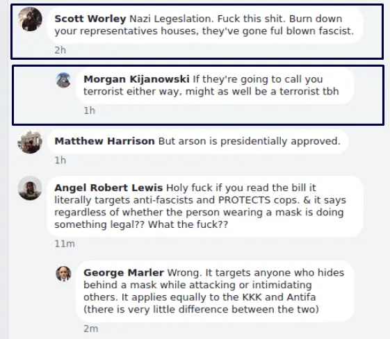 The bill’s name makes reference to Antifa, the far-left extremist group that frequently advocates using violence and sparks riots to block conservative speakers and events. Antifa often use black masks and are clad in all black.