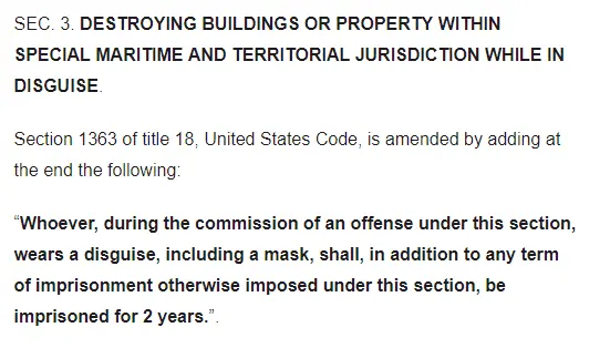 The bill also includes 2 years of jail time for "Destroying buildings or property" while wearing a mask or disguise.