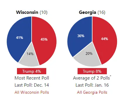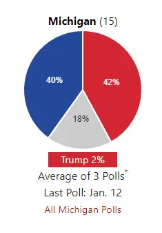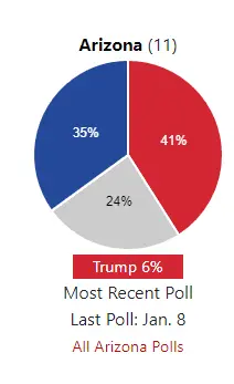 The former president is leading in Wisconsin by 6 points and Nevada by 5 points, pollsters found. His smallest leads are in Michigan and Arizona, leading by 4 and 3 points, respectively.