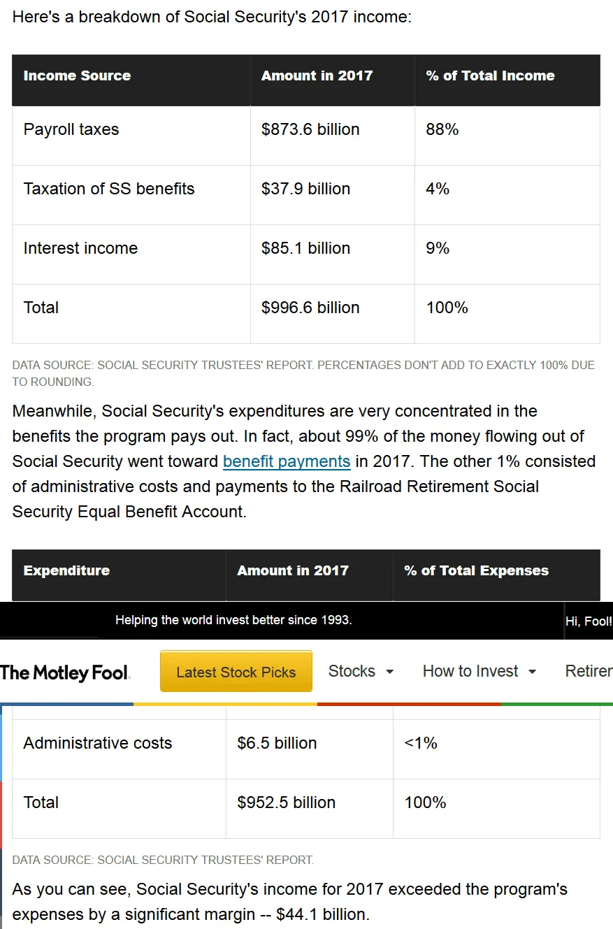 but the government has used about $3 TRILLION of social Security surplus funds to pay for expenditures that federal income taxes should have paid for....and now they are threatening and have reduced Social Security benefits because they can't afford to pay them back for what they used....