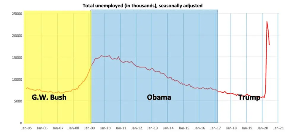 I'm not an Obama supporter or a Trump supporter or a Biden supporter. Didn't vote for any of them, so you can relax, cupcake. I'm simply throwing your guys own dishonesty back in your face. But that aside, you have to be really REALLY intellectually dishonest to blame Trump for the massive jump in unemployment in early 2020 when practically the entire world shut down over a pandemic.