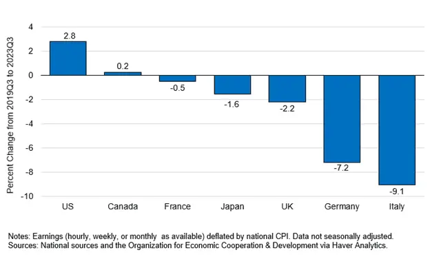 Let’s start with economists’ favorite metric: growth. When an economy is growing, more money is being spent. More stuff is being produced, more services are being performed, more businesses are being started, more workers are being hired—and, because of this abundance, living standards are probably rising. (On the flip side, during a recession—literally, when the economy shrinks—life gets materially worse.) Right now America’s economic-growth rate is the envy of the world. From the end of 2019 to the end of 2023, U.S. GDP grew by 8.2 percent—nearly twice as fast as Canada’s, three times as fast as the European Union’s, and more than eight times as fast as the United Kingdom’s.