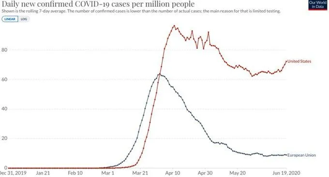 When you have 40% of the populace existing within an ideological news & information bubble that has convinced them that the threat of the virus is overblown and some political conspiracy, and a President who is trying desperately to keep them happy, you know you're not dealing with the problem at an optimal level.Notice how the European Union did a much better job controlling COVID-19 than our great president. It’s not even close. Trump blew it, he was clueless un incompetent Discuss.View attachment 361604