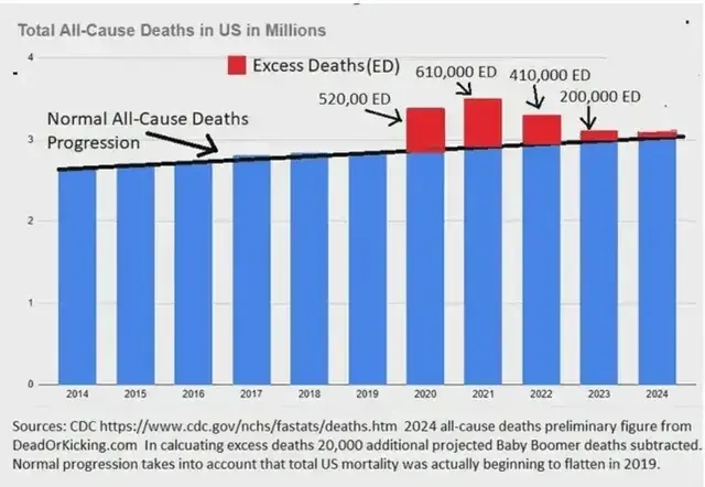 Since 2021, rather than making deaths going down, as it was promised that the COVID vaccines would do, US deaths have reached all-time highs. There were more deaths per year in 2021 - 2024 than any other year in US history.