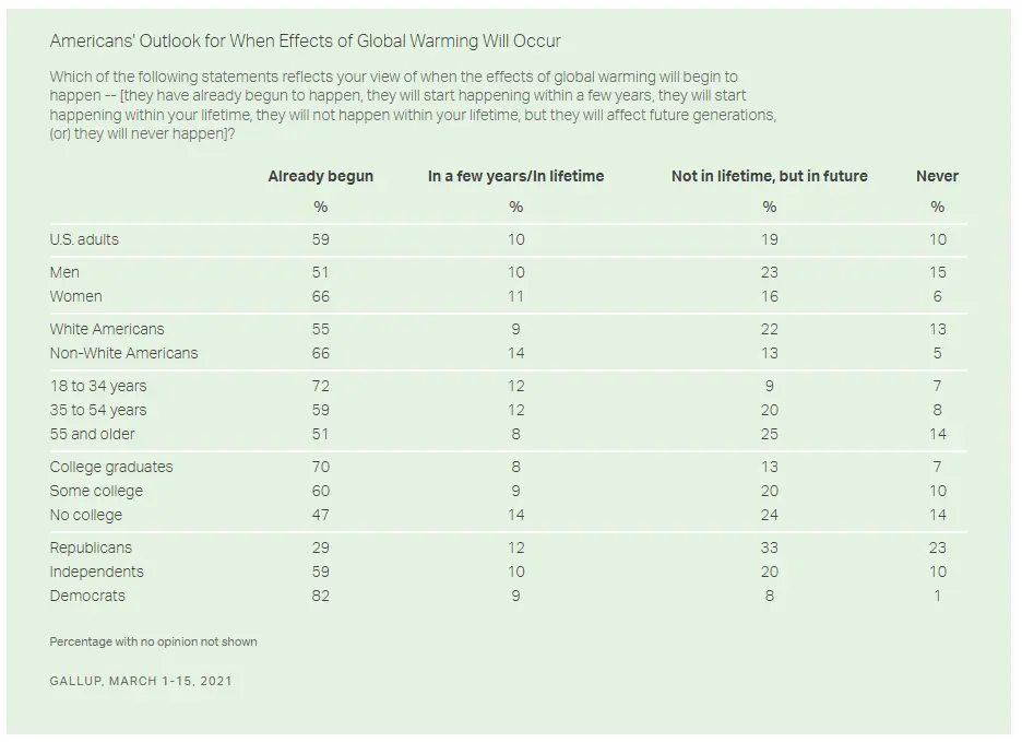 There are lots of different parts to it. This charts when, Americans believe, will the effects of global warming begin to happen. As you can see from the first line, 69% believe either they are already happening or within a few years while 29% believe they will not occur in our lifetimes or never. Breaking that a little further, a simple majority - 59% - of Americans believe global warming effects are already taking place and only 10% believe as many do here, that they will never take place. There are break downs on gender, race, age, college and political party. Belief that global warming is underway or imminent seems to trend with being a young, college-educated, Democratic woman of color. The opposite view trends with being an old, uneducated, Republican, white man.