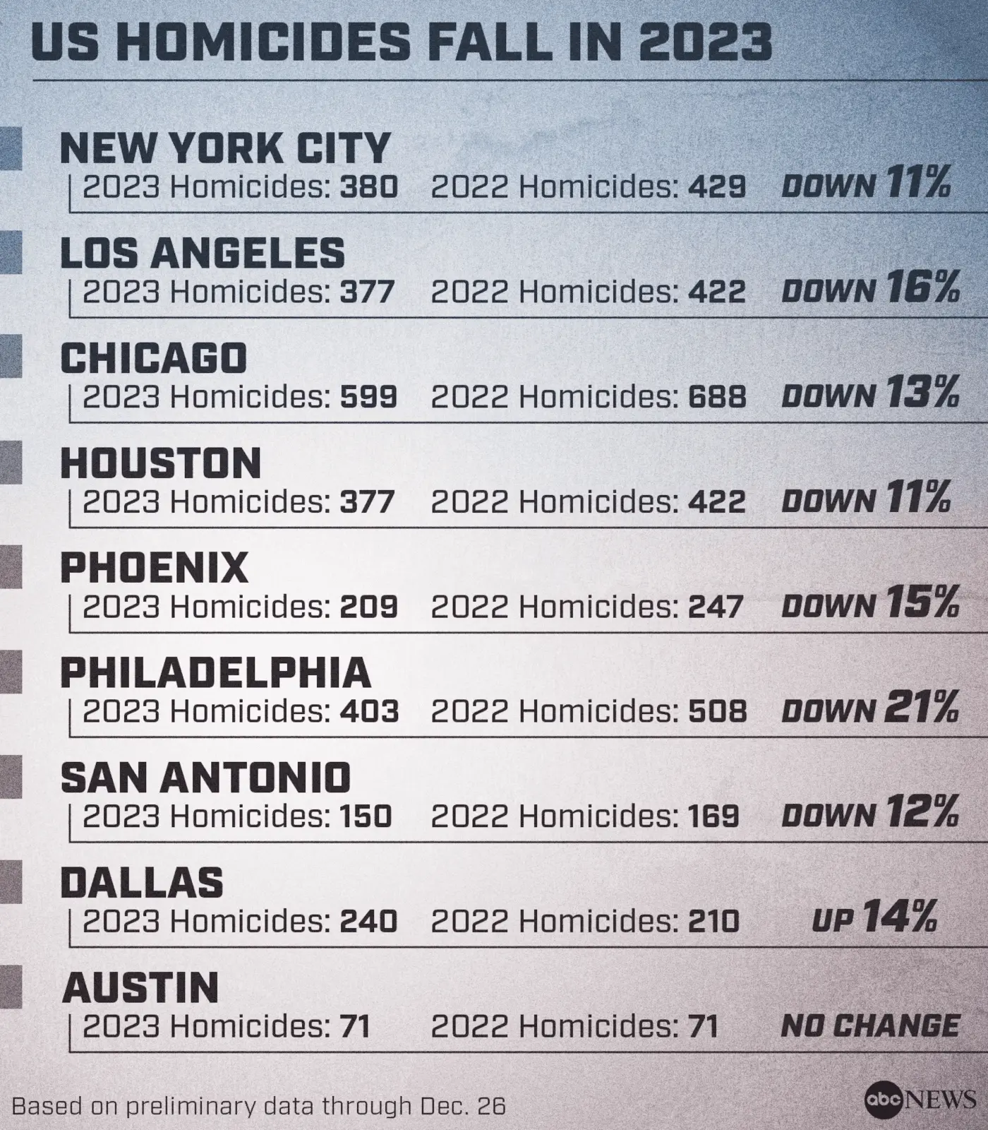 With 2023 ticking down, the nation is poised to finish the year with its biggest annual drop in homicides on record, according to preliminary data from law enforcement agencies both large and small.The homicide rate in the United States is expected to plummet nearly 13% compared to 2022, meaning more than 2,000 fewer people were the victims of homicide this year, Jeff Asher, a national crime analyst, told ABC News.