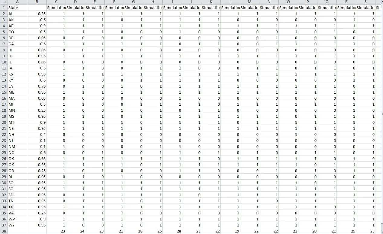 Note that the raw data has different values for total # of seats than the top numbers on the chart Excel file. This is because everytime I refresh the raw data Excel file, the numbers keep changing based on probability. So when I copied/pasted the values to a different file, the numbers changed. However, with 16,000 simulations, the overall average for the 2 sets of numbers should be virtually identical(probably within .01 Senate seat).