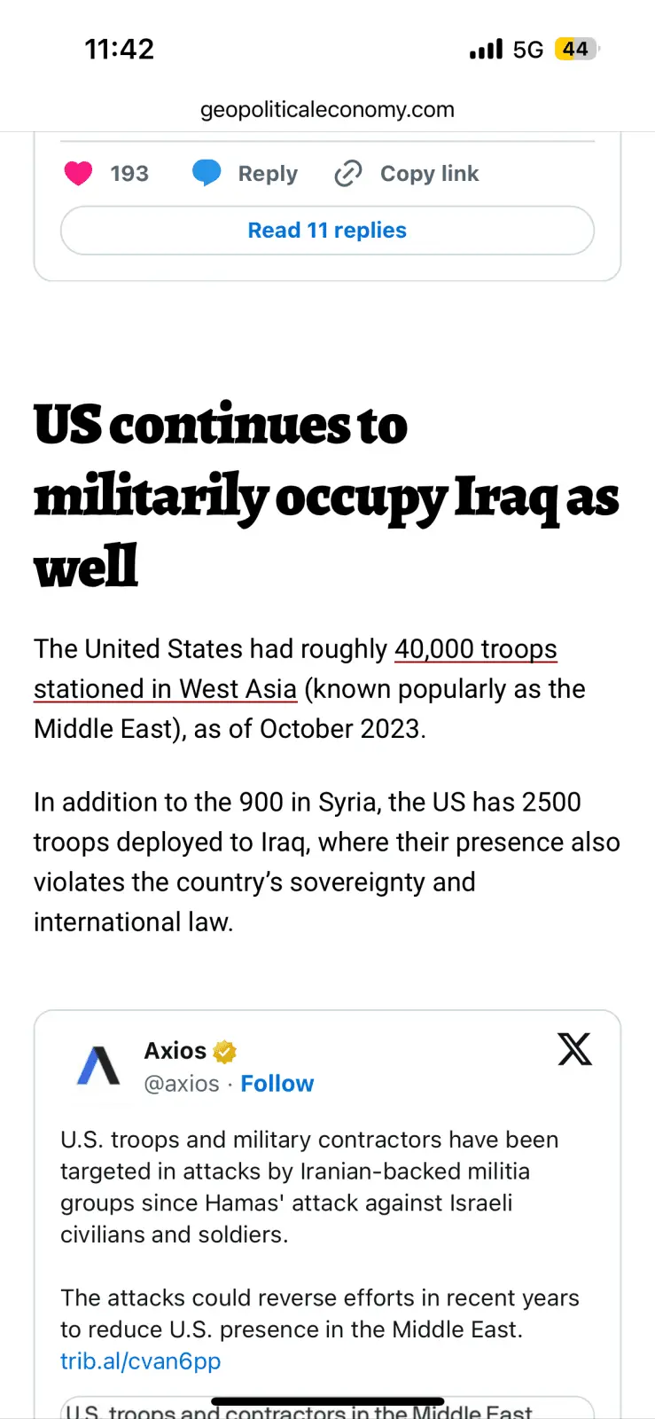 According to that article, thee US presence in Iraq is violating international law and is affecting the countryās national sovereignty..