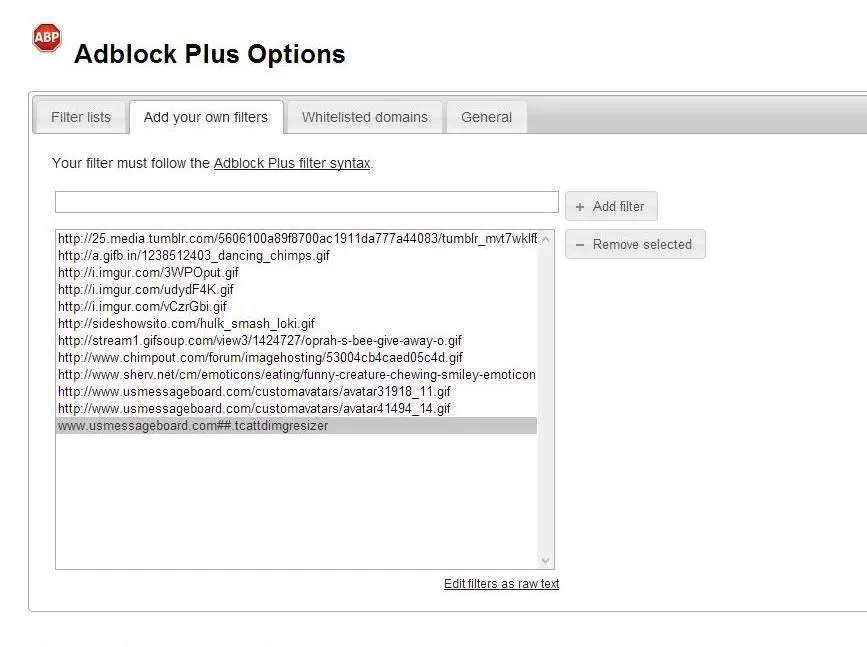 What does your Filter List say? EasyList?I don't seem to have an option to set to "custom", but I have been blocking some images. That seemed to have worked just fine at the time. I don't have a "filter source" either. What I see is attached as a screencap -- I do get a list of blocked elements, and I know how to delete them -- it's just that the images that are being blocked that should't be blocked are not showing up on this list. The list looks exactly as it should. So why it's blocking things not on the list is what I haven't figured out.