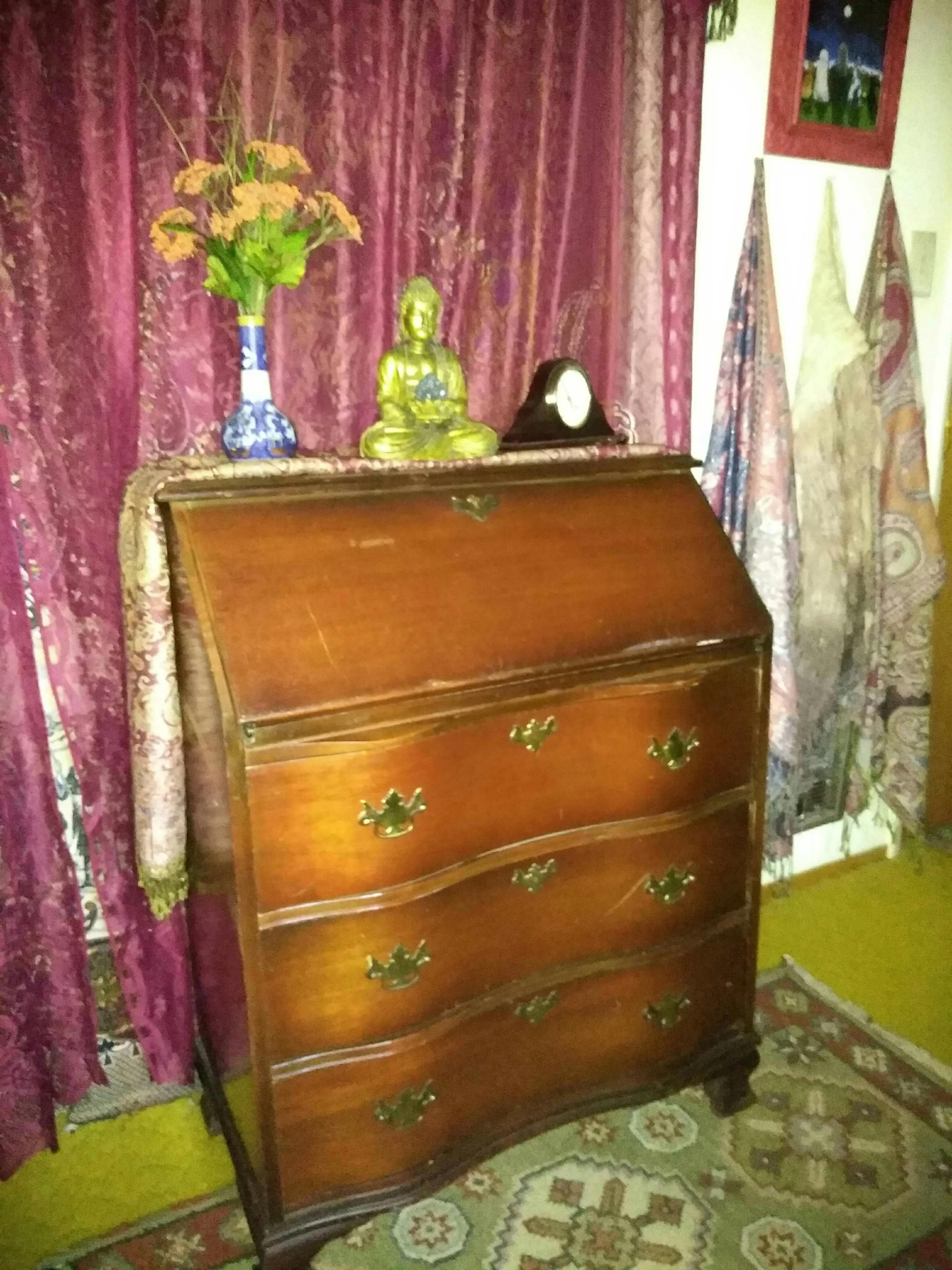 I just got back from one of the thousands of thrift stores and bought the cutest mini antique desk with drop down front. I'm using it as a dresser, but it IS going to be painted eventually. And I picked up this very pretty half moon THICK persian carpet that will fit perfectly on the new kitchen floor in front of the sink. Guess how much I paid for it!! A buck fifty!! This place is a gold mine...but not for reselling. Too many hoarders here and no market for resell. But you can buy just about anything you want...CHEAP. I paid 32.33 for the mini desk. Dovetail. Brass handles. Solid wood. I'll take a pic of it.