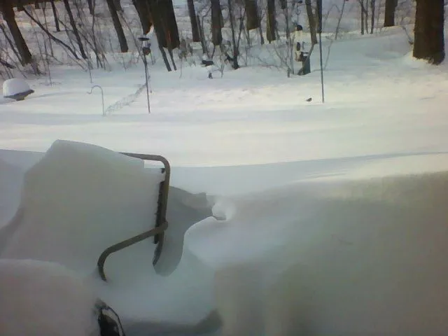 I see the little devil now!Here's a picture of a little bird at my feeder. I don't know how to zoom in, so I hope you can see it. Remember, those outdoor chairs are the bar type of chairs; that's how deep the snow is.
