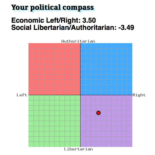 I took it anyhow. Says I'm middle of the road, barely edging liberal (I threw up in my mouth) and authoritarian. After further review, this test was developed by liberals to tell you you're liberal. In Trump's words "very dishonest".