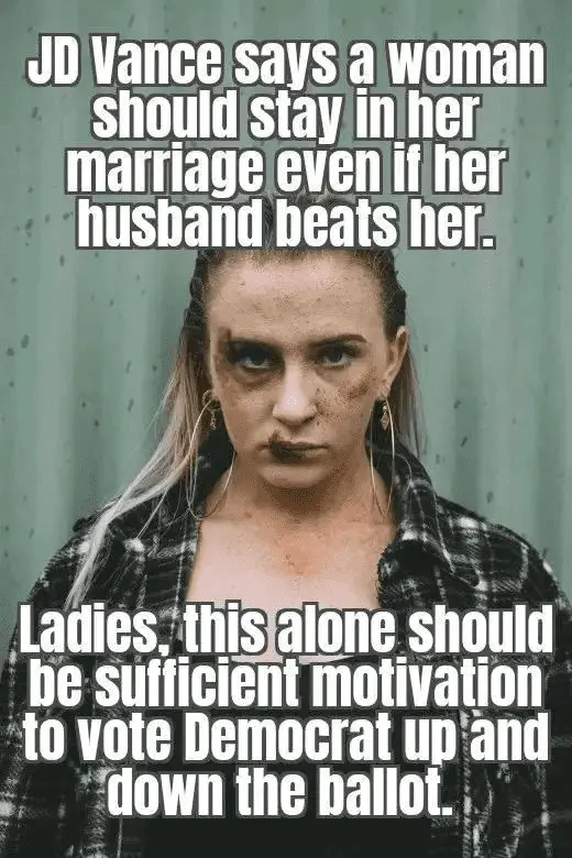 That's actually a tough issue, and it's brought about by Vance's ..... view of sexual "roles." He said divorce damages kids. That's true generally, but are kids better off being raised in abusive homes. If he thinks that, he needs to move to pakistan or wherever. And he does really think women should "stay" for the kids' sakes.