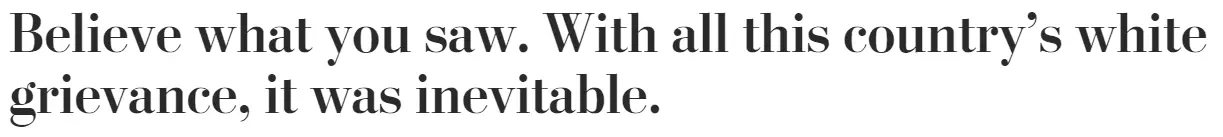 There is a discomfort in talking about the racialized nature of the riot because of the fear that good people might be marked by too broad a brush. Yet it’s clear that a river of rage and anger runs from Jim Crow America to the tiki-torch protests in Charlottesville to the mobs this week that were willing to break doors, barricades, windows and laws on the day Joe Biden was certified to take Trump’s place. Something is being snatched from them and it’s not just money or jobs or security or even the White House.