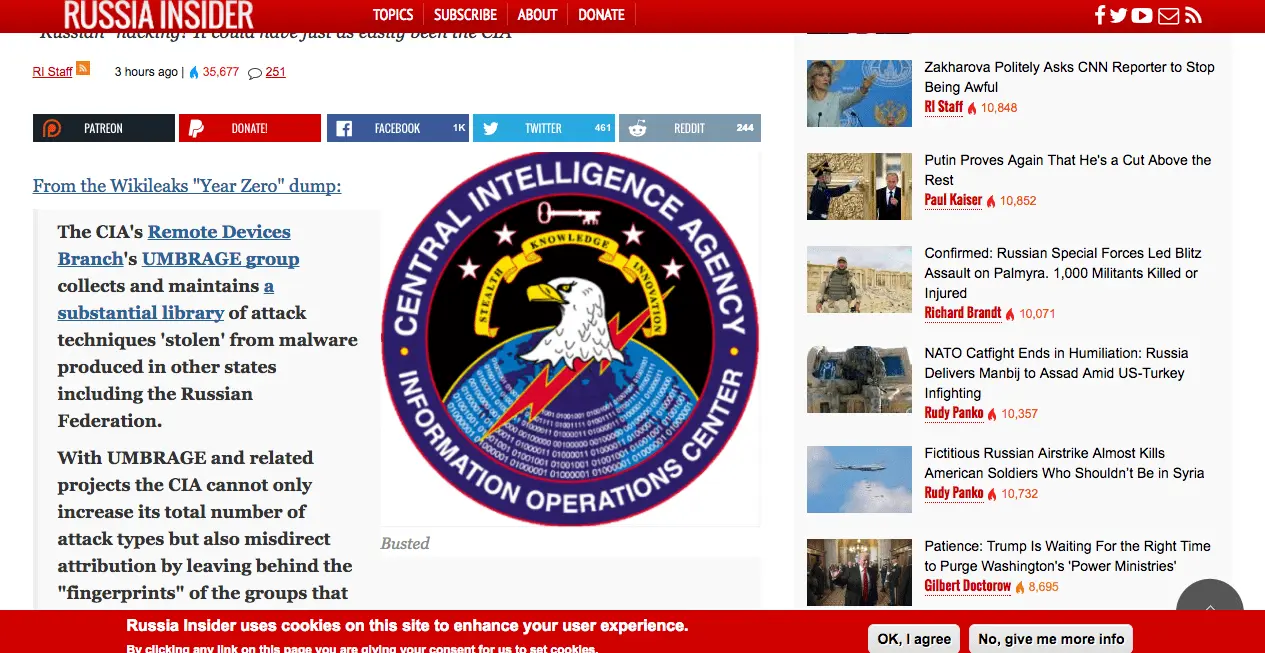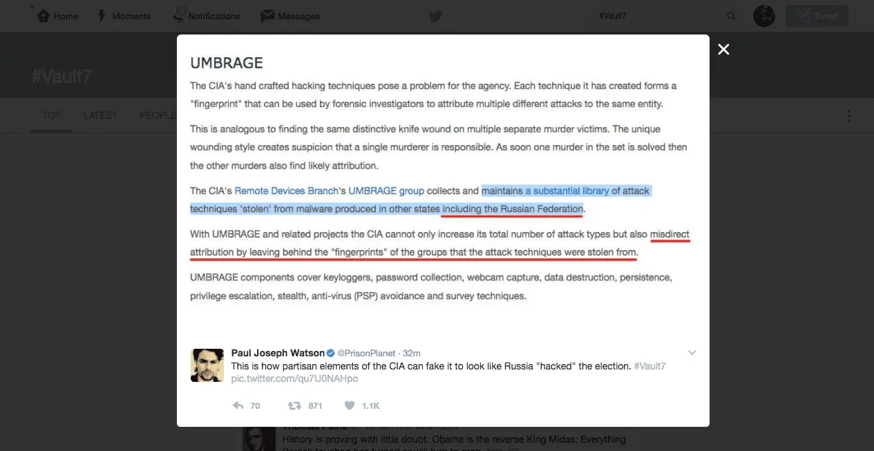 Umbrage: The CIA's Remote Devices Branch's UMBRAGE group collects and maintains a substantial library of attack techniques 'stolen' from malware produced in other states including the Russian Federation. With UMBRAGE and related projects the CIA cannot only increase its total number of attack types but also misdirect attribution by leaving behind the "fingerprints" of the groups that the attack techniques were stolen from.