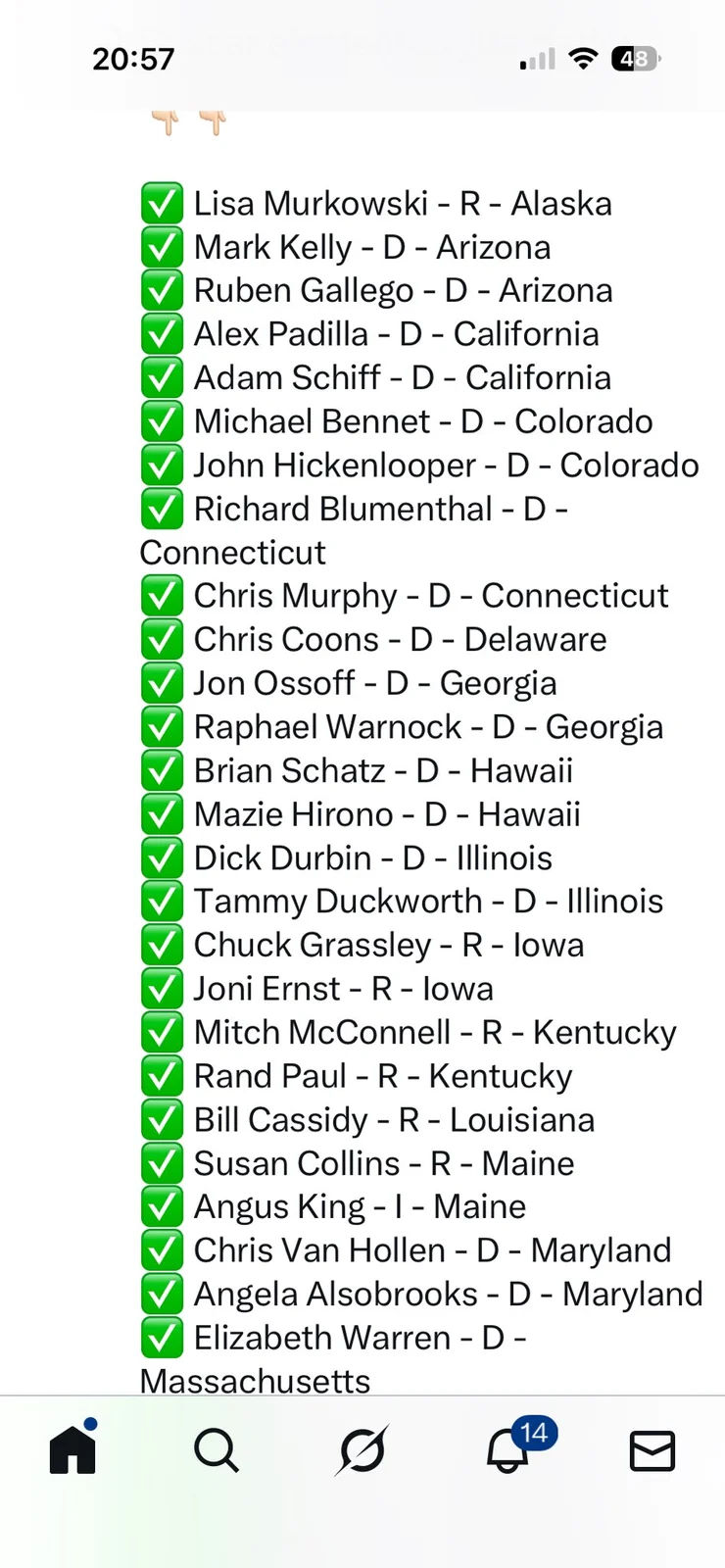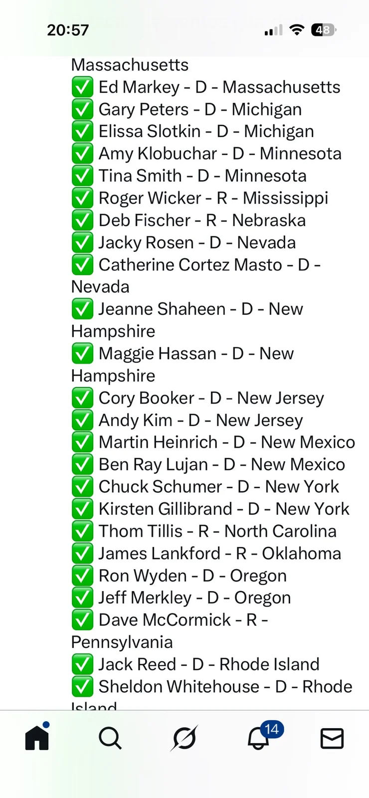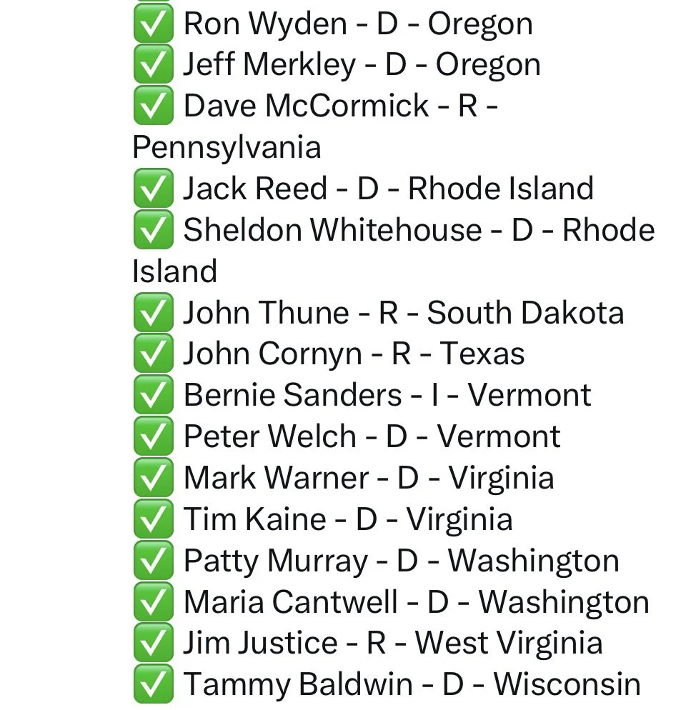 //* All pasted in one post, unlike above. Mostly filthy lying DEM with the usual turncoat R. Including Thune, Paul. *//
