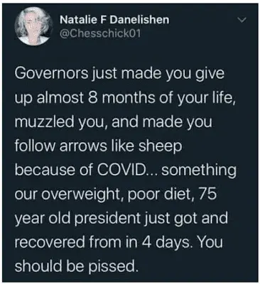 I think that the majority of people want to go back to their old normal lives that they lived just nine months ago. Today there is no fun anymore. Fun has been abolished by your politicians and the globalists. Only boring days is all we get these days. It would be a lot better to live and enjoy life and have fun again rather than living the life that we are all being forced to live with today. Stop being a maskhole and woke the hell up. Just saying.