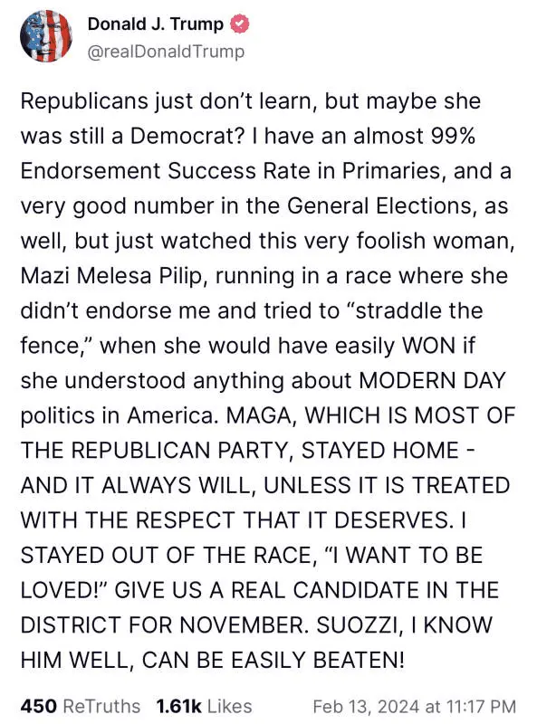 Trump took to Truth Social to attack GOP candidate Mazi Pilip after her election loss to Tom Suozzi in New York’s special election.