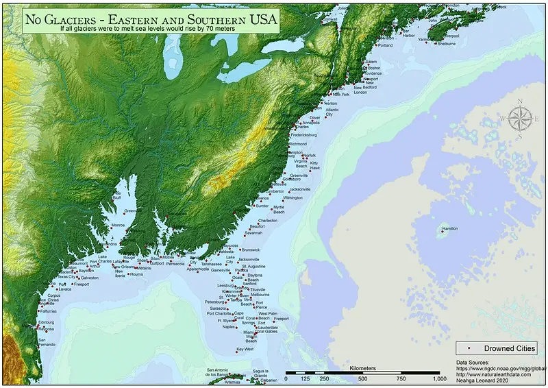 If all the ice covering Antarctica, Greenland (Antarctica would make about 60 meters of sea-level rise, Greenland about 7.4 meters), and in mountain ice caps around the globe were to melt, sea level would rise about 70 meters (230 feet) and cover all seaside cities.