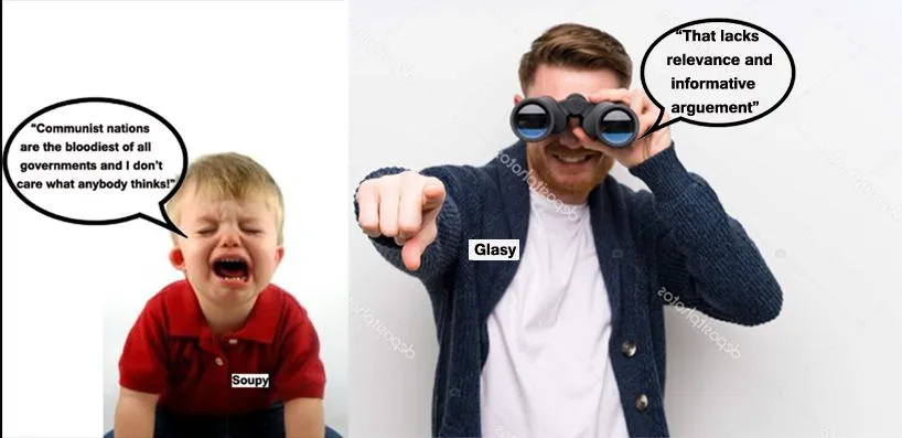 Lack of knowledge coupled with a yearning to participate in discussions/debates on subjects you know very little about can be frustrating, particularly now that your irrelevant mis/disinformation is being challenged. Your comment, "Communist nations are the bloodiest of all governments" is too silly to be taken seriously enough without the need to get personal. Your comment is childish and unsubstantiated and has no relevance.Your ability to guess is as lame as your comrehension of poligtics. Notice how you had to get personal before going anywhere else. You lack any intelligent argument.My guess is that you are between the age of 13 and 18. Am I right?I do notThen why do you respond with the ignorance of a child?I have more knowledge understanding and insight than you.