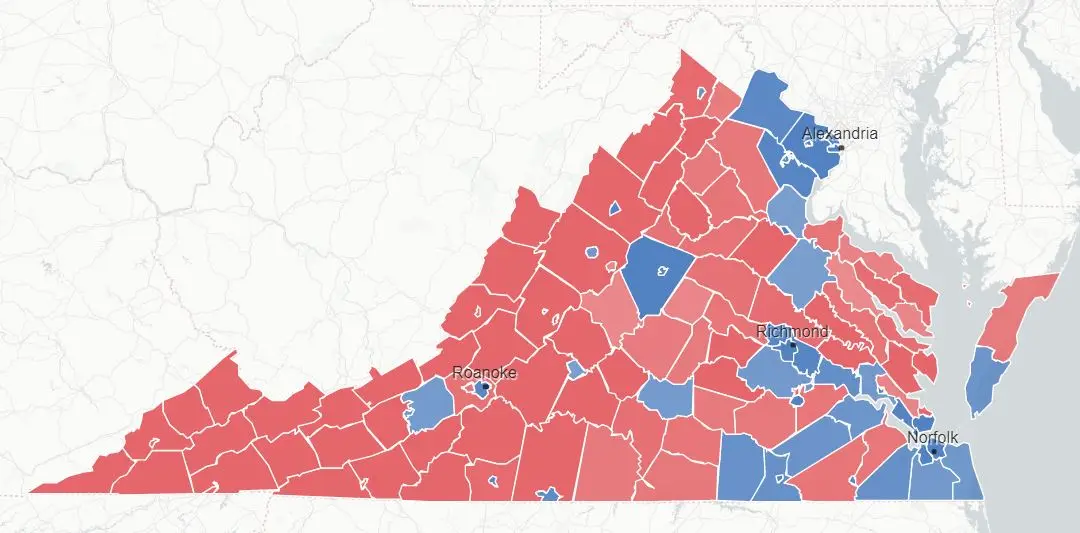 Watching the election returns for awhile last night, the vast majority of Virginia counties still voted sensible red. But unfortunately those deep state indoctrinated Democrats are concentrated in the larger population areas and can call the shots. And that is tragic for Virginia.