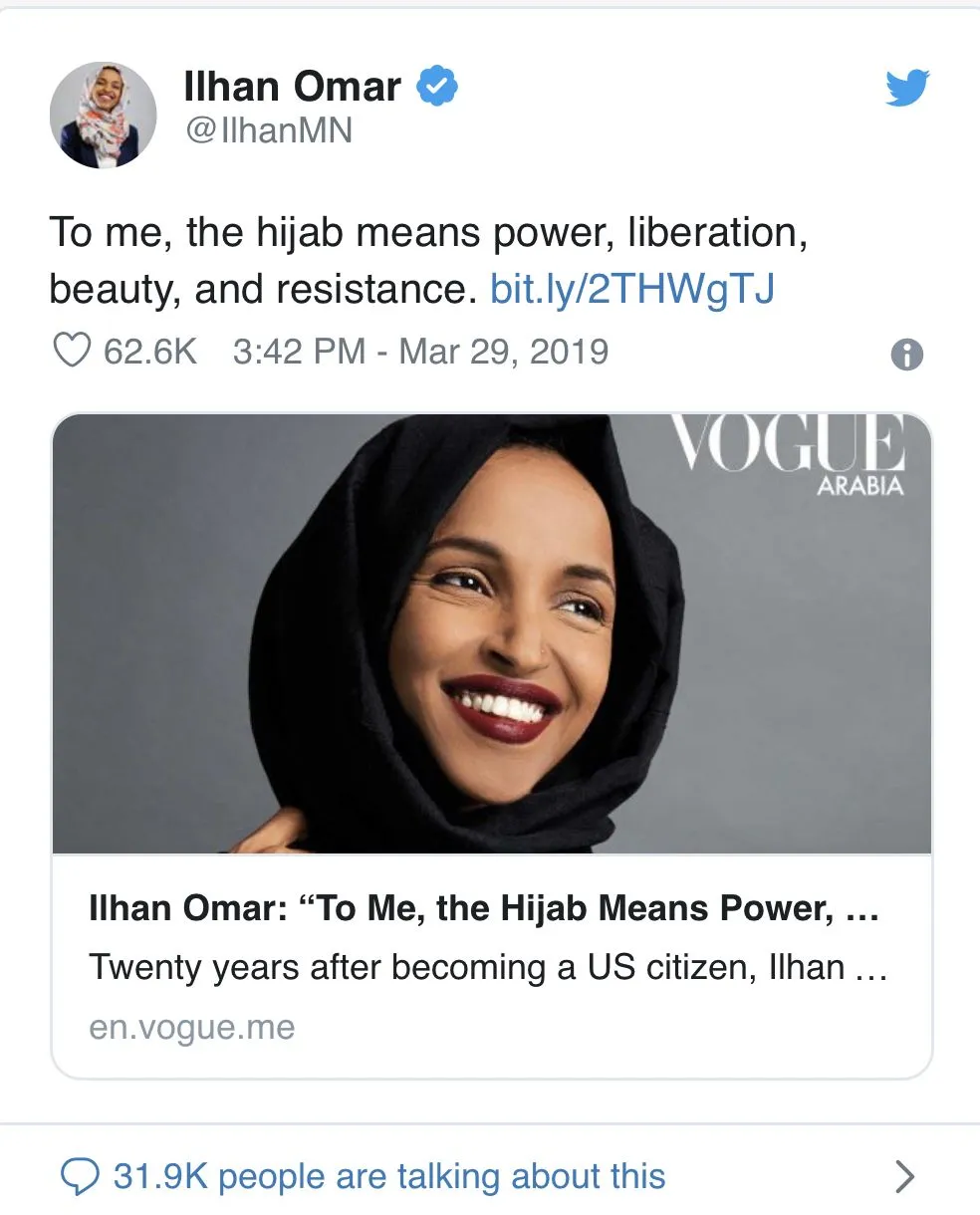 Vogue cover star Rep. Ilan Omar explains how the hijab means resistance and liberation; Updated