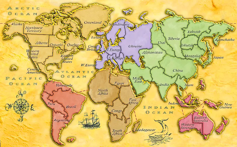 Since each land space may only contain one troop the player begins expanding from their starting land by placing troops in any adjacent land space that they wish to occupy or conquer. To conquer a land the attacker moves one unit into the land space either from adjacent land or through a sea with a ship in it. Then dice are rolled, the attacker gets 2 dice and the defender only one, unless the attacker traveled across a strait or the defender's land has either a forest, the great wall of China, or mountains on the border of the land that the attacker came from. In this case the defender receives 2 dice as well. If the attack comes from the sea the defender gets 3 dice for defense. Highest score wins with ties killing off both the defender and attacker. In this case the attacker can merely place the next troop, if he has any left, in the now-empty land space.