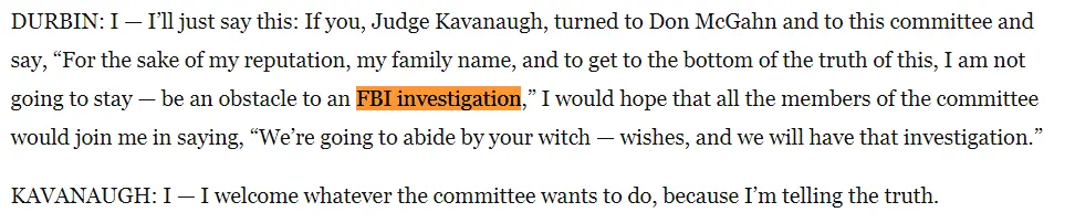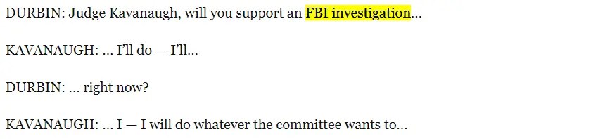 I didnt answer your question because its a weak deflection.Whats loaded about asking if Kav will ask for the FBI to investigate? If he says no then that means he wont. If he says yes then that means he will.He doesnt clearly say he will ask for an FBI investigation. Its a yes or no. Saying he will do whatever the committee wants instead of answering the question is evasive. His answer was typical liar avoidance behavior.No he didnt say that. He was asked if he would welcome an FBI investigation and he said he worked hard to get where he was or he was just silent.