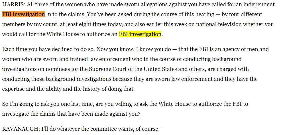 There is no rule that says he cant ask for an FBI investigation. He is Drumpfs nominee. Thats why he didnt say "no...I cant ask for an FBI investigation"..Whats loaded about asking if Kav will ask for the FBI to investigate? If he says no then that means he wont. If he says yes then that means he will.He doesnt clearly say he will ask for an FBI investigation. Its a yes or no. Saying he will do whatever the committee wants instead of answering the question is evasive. His answer was typical liar avoidance behavior.No he didnt say that. He was asked if he would welcome an FBI investigation and he said he worked hard to get where he was or he was just silent.