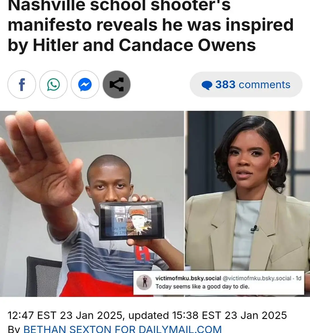 Nashville school shooter's manifesto reveals he was inspired by Hitler and Candace Owens.