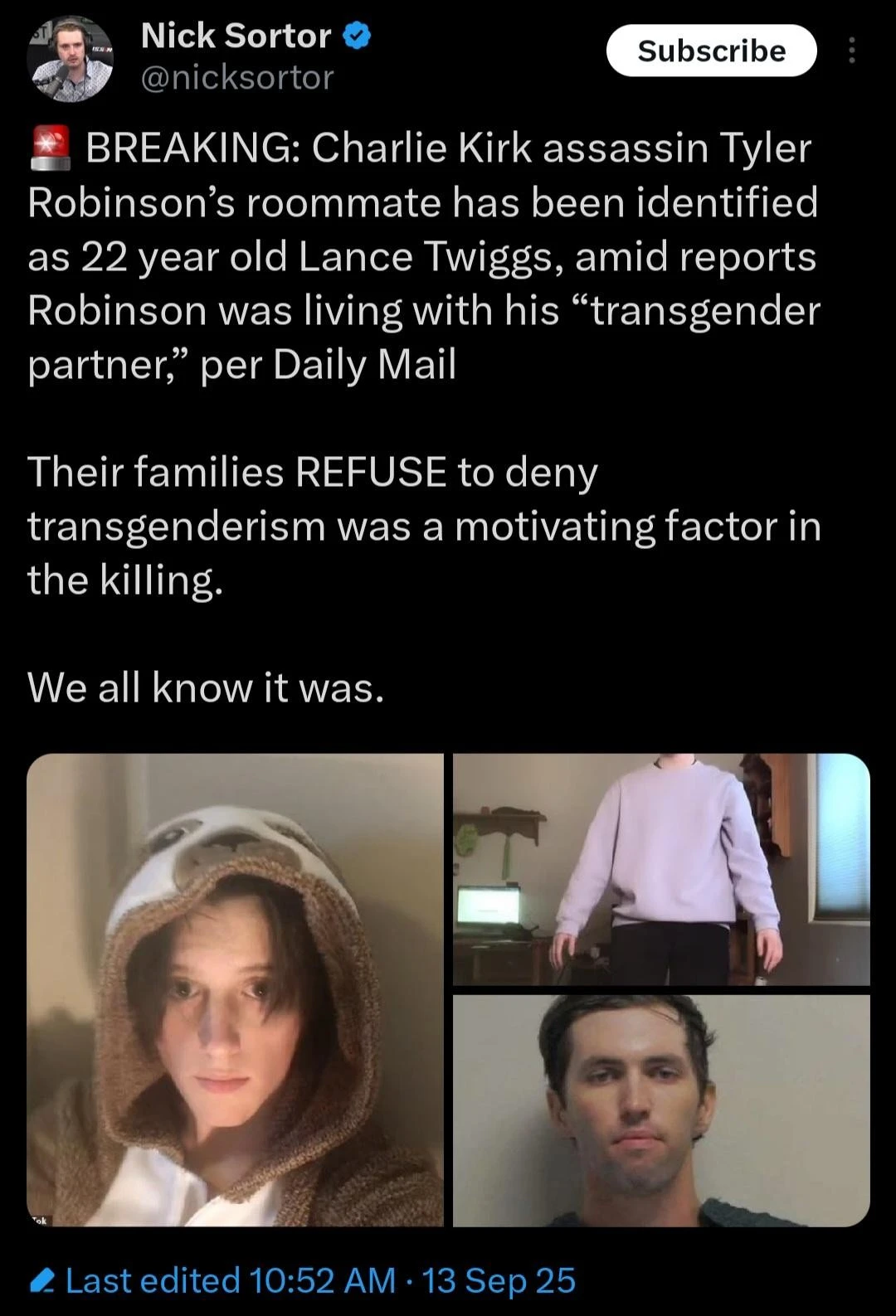Per Fox News reporter Brooke Singman: Charlie Kirk assassin Tyler Robinson lived with his transgender partner, sources tell me.