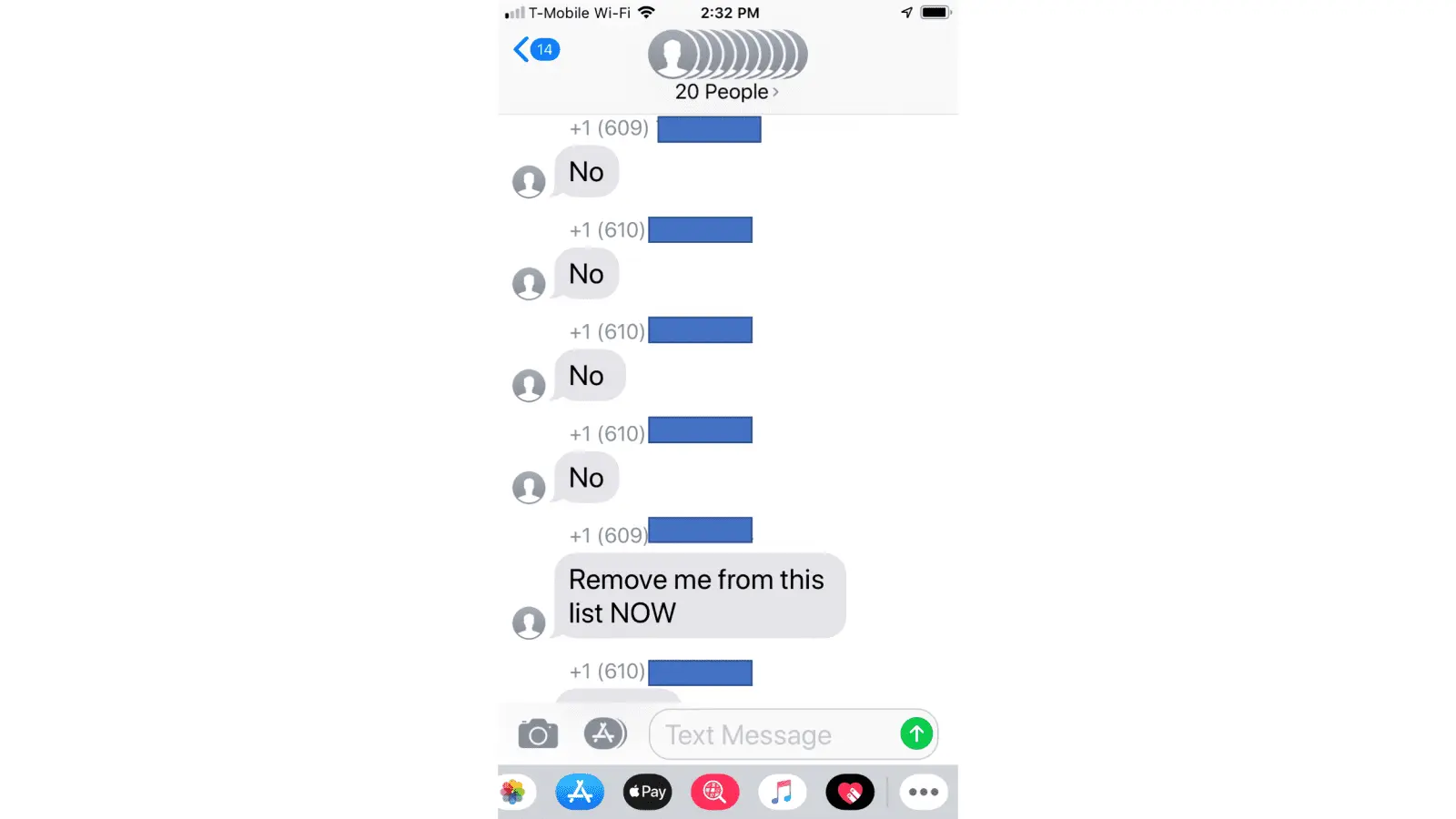 Next day, I get this 20-person mass message on my phone, primarily from the 610 area code: