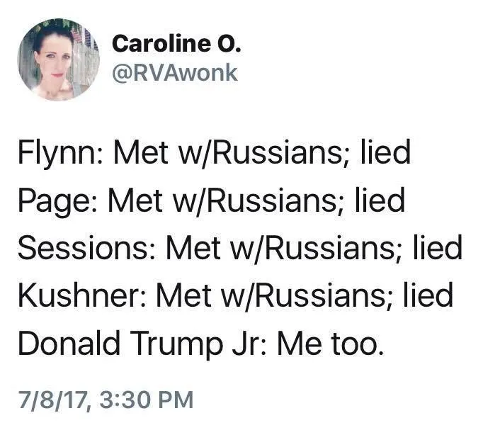 Exactly. We're going to believe junior that " nothing came out of the meeting."The email Trump received said she was a representative of the Russian government and thats exactly why he went to meet with her.Sorry, Junior, but listen to the russian attorney herself. She has said in every interview that she has no ties to the russian government. Quit picking and choosing whatever material fits your own crooked smear agenda.