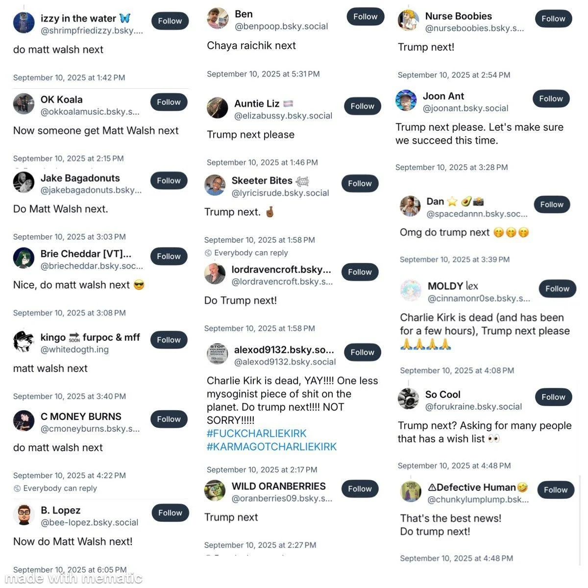 Americans, on both sides of the political spectrum, are incensed by the senseless assassination of Charlie Kirk. There needs to be a focus on the needs of Kirk’s wife and children, so sad. There are idiots on both sides of the political spectrum who react, inappropriately, to violence toward politicians of the opposite party. In the past several months, besides the Charlie Kirk assassination, there were two attempted assassinations of Donald Trump, an attempted assassination of two democratic Minnesota legislators, ending in 3 deaths. and an arson fire started in the home of the democratic governor of Pennsylvania as his family slept upstairs.