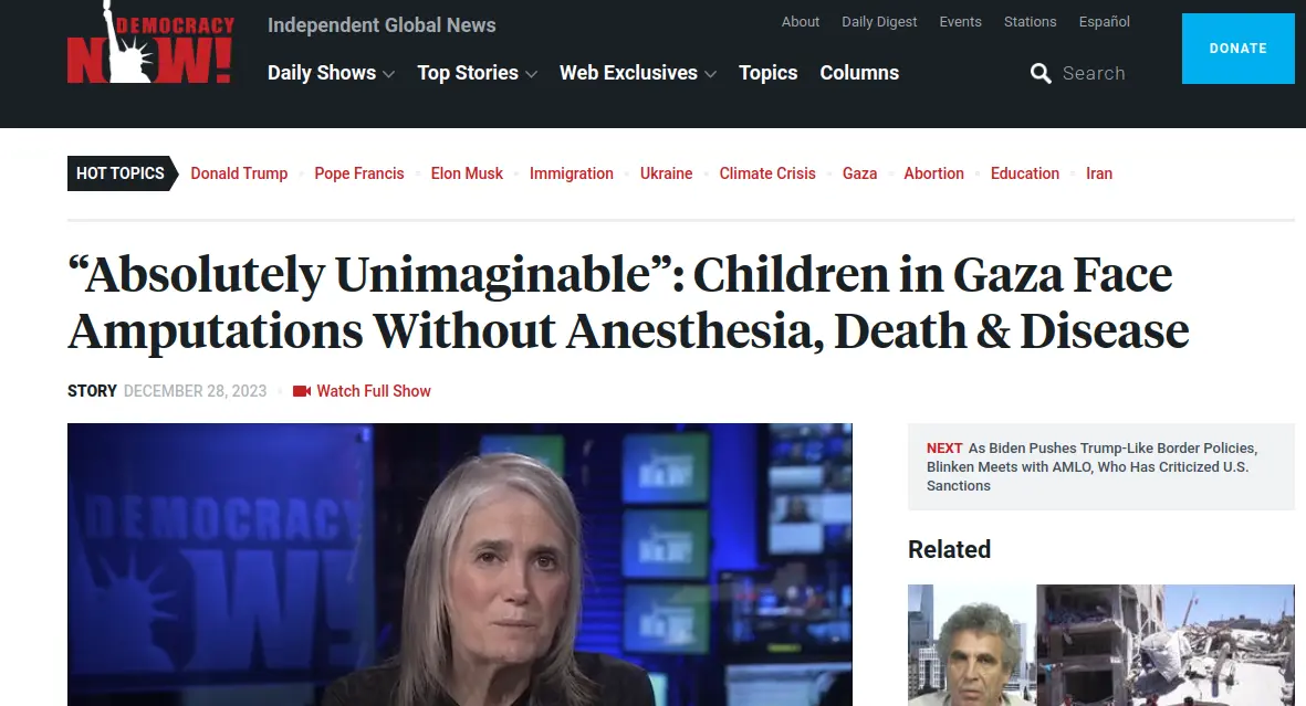 "Israel has killed more than 8,200 children in Gaza, which the U.N. now calls the most dangerous place in the world to be a child. We speak with Steve Sosebee of the Palestine Children’s Relief Fund, which provides medical and humanitarian aid to Palestinian children in Gaza and the West Bank, about how at least six Palestinians the organization had brought to the United States for free medical care have now been killed in Gaza. Sosebee shares the stories of Izzeddin Nawasra and Mohammed Al-Ajouri, two young men who were shot by Israeli snipers during the Great March of Return protests in 2018 and received medical care in the U.S. from PCRF. Both were killed alongside their families by Israeli airstrikes on and after Christmas Day. Sosebee also describes the state of medical care in Gaza, where patients are being forced to undergo amputations without anesthesia and forgo life-saving medications amid Israel’s ongoing blockade."